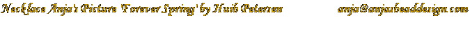 | California, June 2016 Dear Visitor, Thank you for visiting my website! The latest info regarding current workshops you will find by clicking on the tab 'Classes Page 5'. I have had difficulties getting into my site for quite a while and am just now able to update it again. Please contact me if you are interested in more detailed information. Thank you! Sincerely, Anja Anja S Bead-Design |